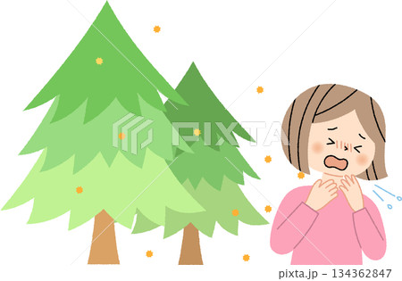花粉を出す杉の木とくしゃみをする女性単色