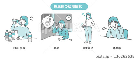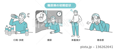 糖尿病の初期症状イラストセット(喉の渇き・多尿・体重減少・倦怠感)