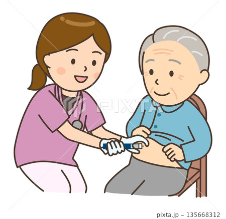 女性看護師にインスリン注射をしてもらうおじいさん