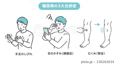 糖尿病の三大合併症(しめじ)の症状イラストセット(しびれ・網膜症・腎症)