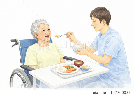 お爺さんの食事をサポートする介護士のイラスト