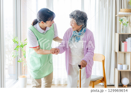 介護イメージ 杖をついて歩くシニア女性と介護士