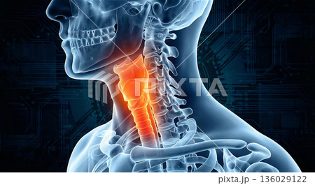 喉の痛みと炎症のイラスト 扁桃腺 声帯 食道 骨格レントゲン 3DCG 広告素材