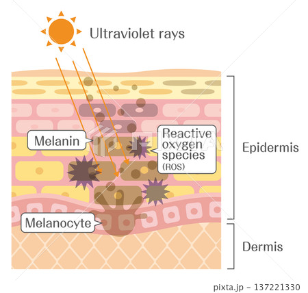 紫外線によるメラニン生成と活性酸素の皮膚断面図・肌構造イラスト