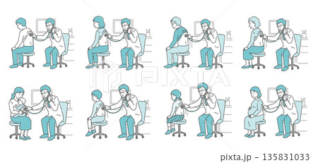 白衣の女性医師による全世代の患者の聴診イラストセット(老若男女・妊婦)