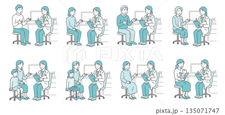 【8点セット】問診をする男性医師と様々な患者のイラストセット(スクラブ・全世代)
