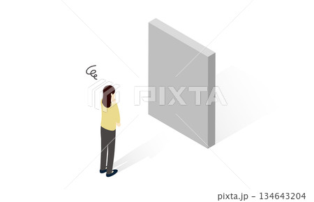 障害となる壁を前に悩む女性のアイソメトリックイラスト
