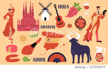Spain travel icon. Spanish culture. Dance flamenco with fan. Madrid bullfighting. Famous cathedral. Guitar and national food meal. Landmarks collection in Mediterranean country. Vector sightseeing set