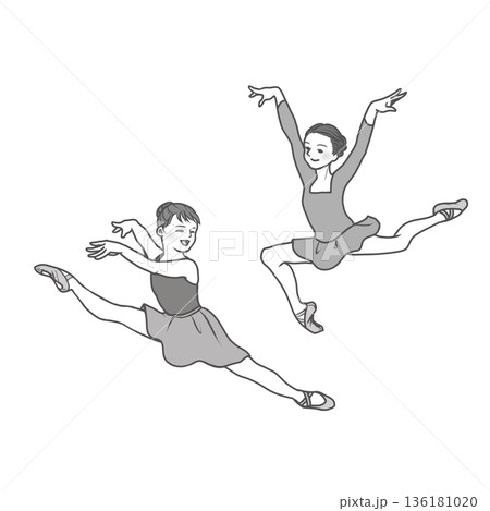 ピンクと紫色のチュチュを着て踊るふたりのバレリーナ