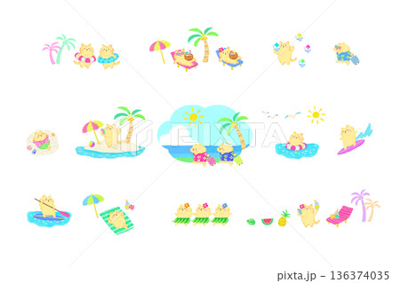 夏リゾートを楽しむかわいい猫の手描きイラスト素材 セット