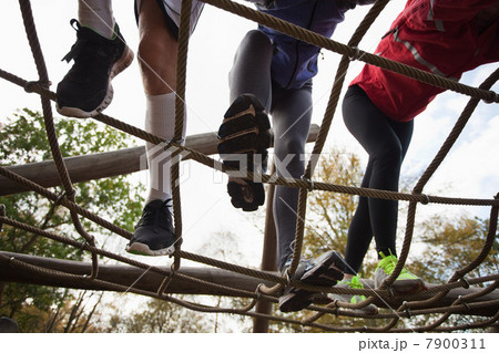 Young friends climbing assault course equipment