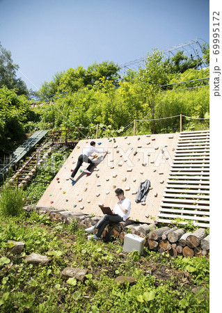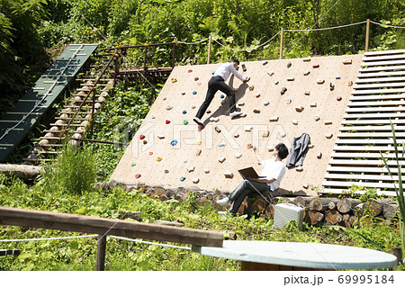 クライミングウォールの前で仕事をするビジネスマンとボルダリングを楽しむビジネスマン