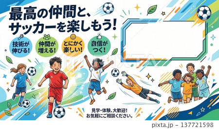 サッカースクール生徒募集のバナー・チラシ用イラストテンプレート(笑顔で楽しむ子供たち)