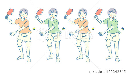 ピックルボールを楽しむ老人女性のイラストセット