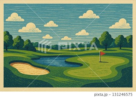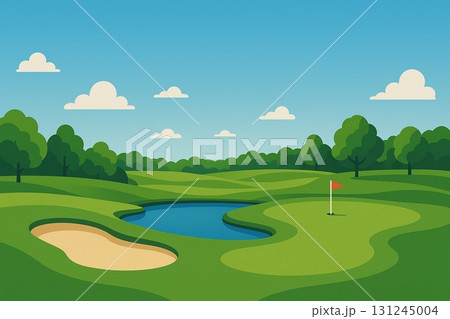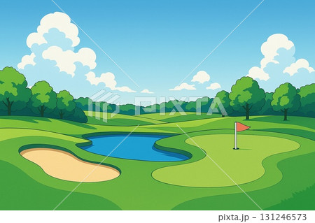 デジタルイラストが晴れた日のゴルフコースを赤旗と共に描く