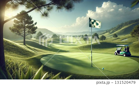 青空の下、緑の旗がはためく牧歌的なゴルフコース