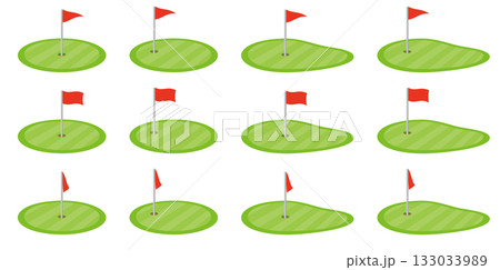 様々な形のゴルフグリーンと旗のアイコンのベクターイラストのセット