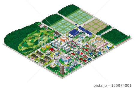 街並みの立体図. 都市の景観. アイソメ図で描いた都市.