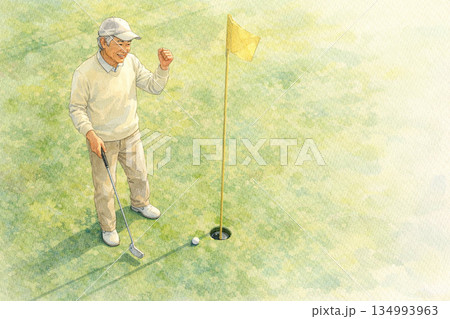 パッティング成功に笑顔がこぼれる日本人シニアゴルファー