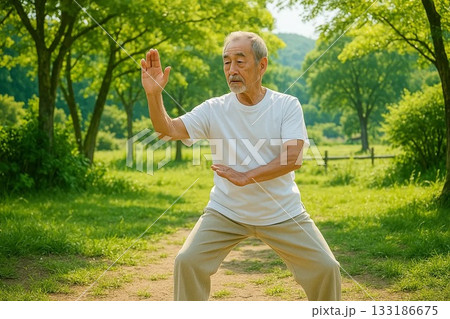 冬の朝の公園の森で太極拳をやるシニア男性の姿