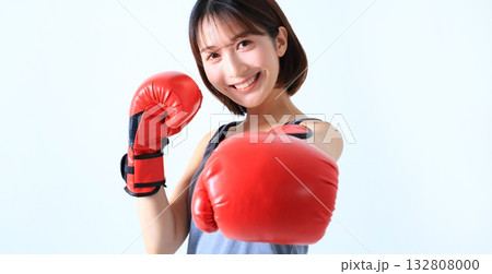 ジムでボクササイズ運動するかっこいい女性 ファイティングポーズ