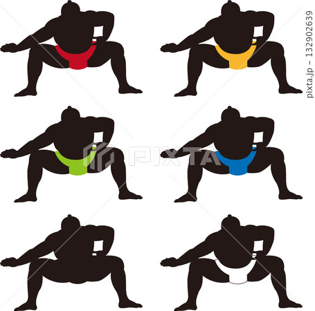 蹲踞の姿勢からポーズを決めるお相撲さんのシルエットセット