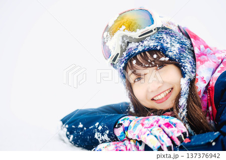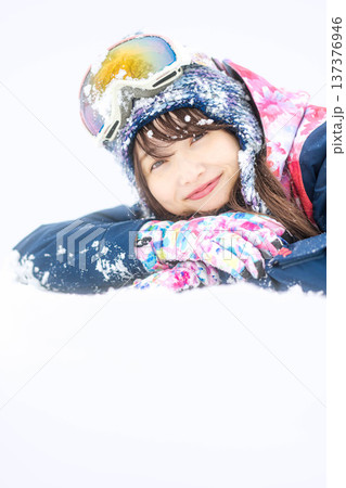 雪の上に寝そべる若い女性