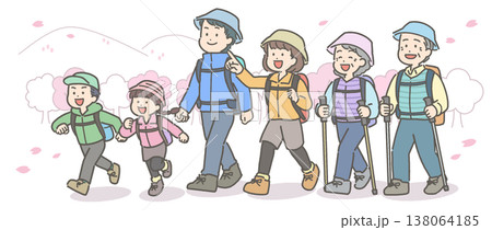 桜が咲く中でハイキングをする3世代家族のイラスト