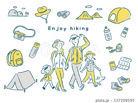 ハイキングを楽しむ家族とハイキング道具の手描き風イラストセット