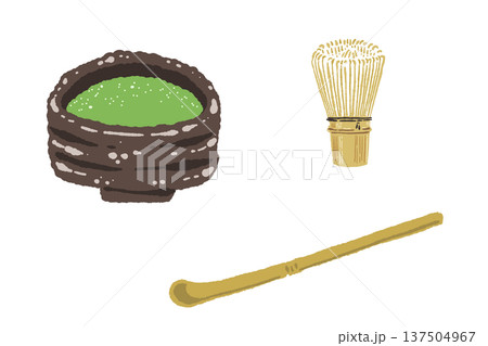 抹茶の粉末と茶杓(ちゃしゃく)のイラストセット