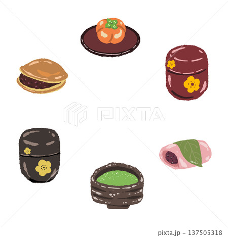 色々な和菓子と抹茶碗を並べた賑やかなライン素材