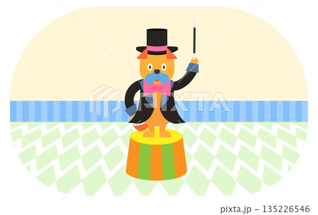 ステージの上で手品を披露するマジシャンの犬のイラスト