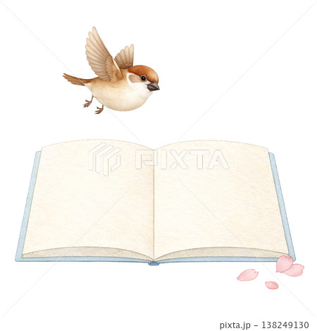 ノートと小鳥と桜のシンプル素材 ナチュラルな読書イメージ 春の学習デザイン 白背景