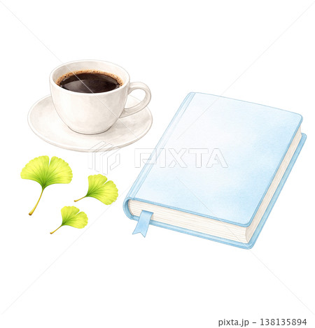 本とコーヒーと新緑の葉のシンプル素材 ナチュラル読書イメージ 白背景