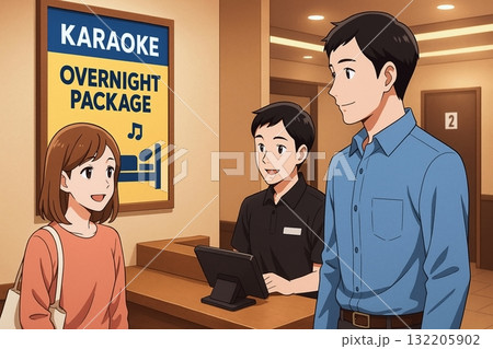 宿泊パックを案内するカラオケ店の受付 落ち着いた雰囲気のカウンター風景