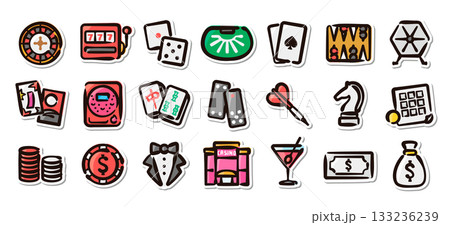 カジノとギャンブルの手描きイラストステッカーセット ゲーム、賭け、エンタメのベクター素材