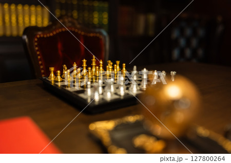 Close-up of gold chess pieces on a board, capturing a strategic moment in a contemporary environment.