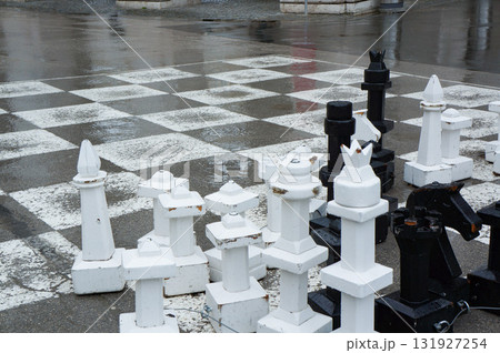 An Outdoor Giant Chess Set Displayed in an Urban City Setting for Local Engagement and Fun