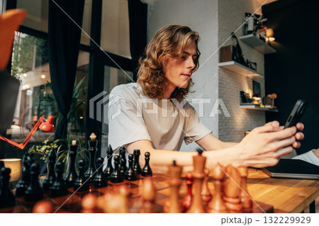 Young man working on laptop with chess set in modern cafe setting during afternoon