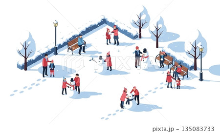 雪だるまを作る子供たちと雪の木のアイソメトリックイラスト