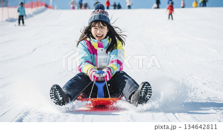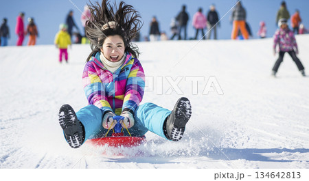 冬の休日、家族とソリで雪山を滑り降りる幸せ