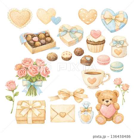 ベージュカラーのバレンタインギフトとローズの水彩素材セット