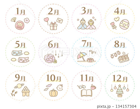 季節の行事のイラストセット、12ヶ月のかわいいカレンダーのタイトル01