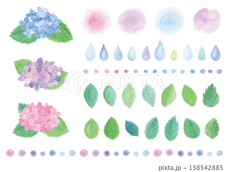 カラフルなあじさいと葉っぱや飾りラインのセット