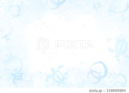 海とウミガメとヒトデの水彩フレーム背景 夏のご挨拶や暑中見舞いのデザイン素材