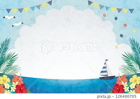 夏の水彩背景フレームイラスト、夏イメージ