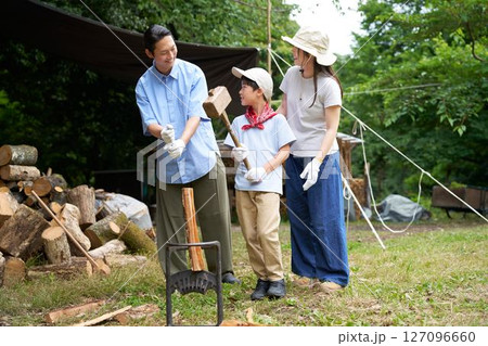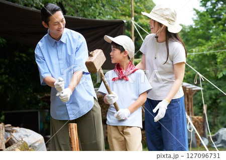 キャンプ場に遊びにきておままごとをする女の子・子供(ファミリーキャンプ)