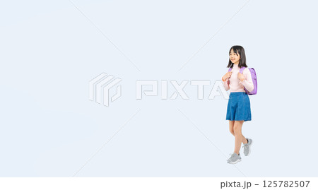 前向きに歩くランドセルを背負った小学生の女の子の全身写真