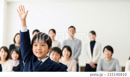 手をあげて発表する少年