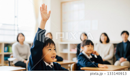 授業で椅子に座り手を挙げる小学生